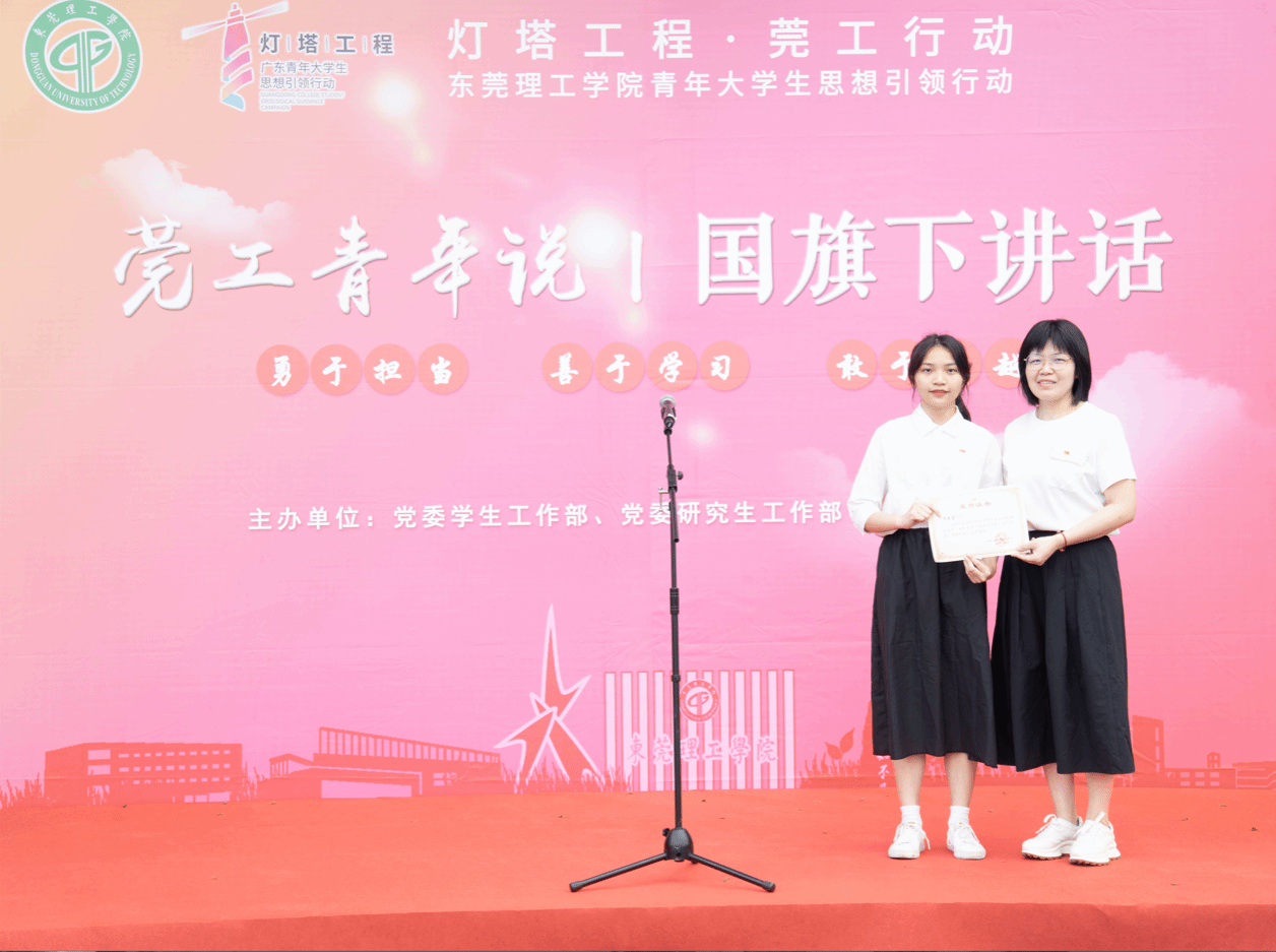 升旗仪式后,sunbet,sunbet官网2020级投资学1班的宋美莹同学登上莞工青年说的舞台,在国旗下分享自己是如何在大学三年间不断披荆斩棘,砥砺奋斗的莞工故事。宋美莹同学结合习近平新时代中国特色社会主义思想以及自身大学实践经历强调,当下青年要如何坚守初心并保持对生活的热爱,通过挥洒热泪与汗水去实现自己的伟大理想。同时,宋美莹同学积极鼓励同学们把握当下时代背景,抓住粤港澳大湾区建设等重大事件机遇,激扬青春、服务同学,为自己的青春留下更亮丽的底色。