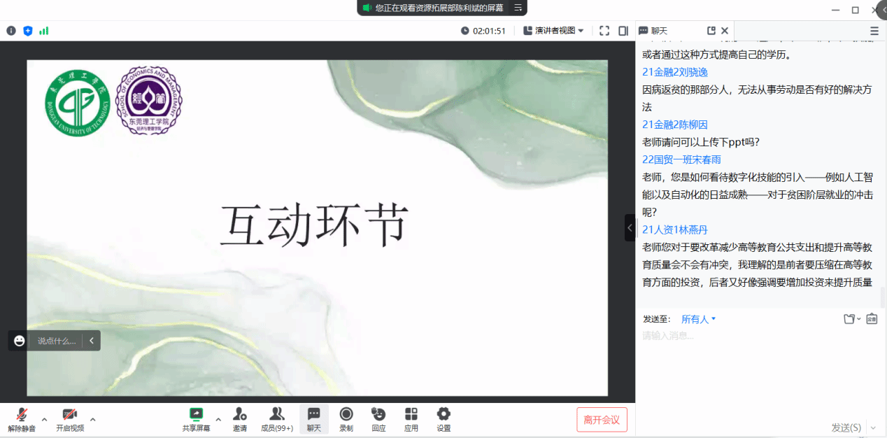 最后,在师生交流互动环节张学英教授就同学们的问题进行详细解答,并在解答的过程中将教育反贫困问题衍生到大学生成长历程,对同学们明确发展方向、坚定理想信念提供了思想引领。