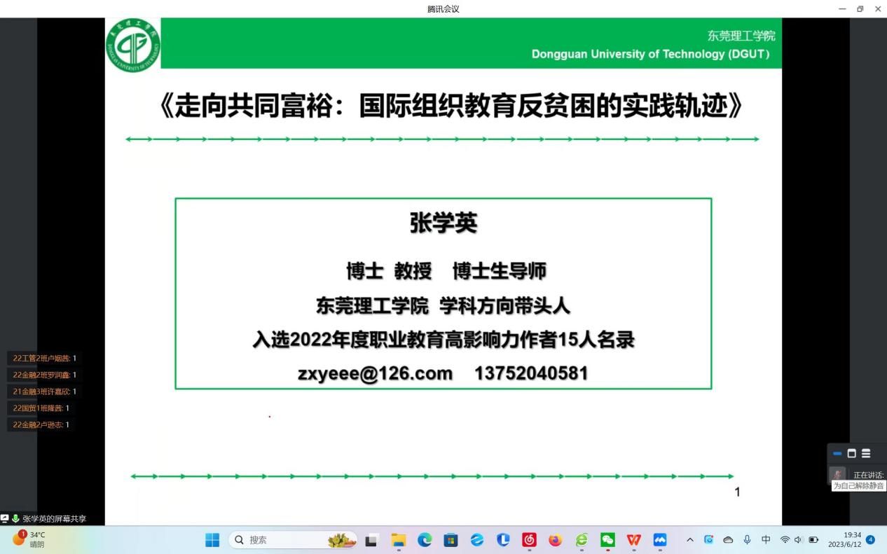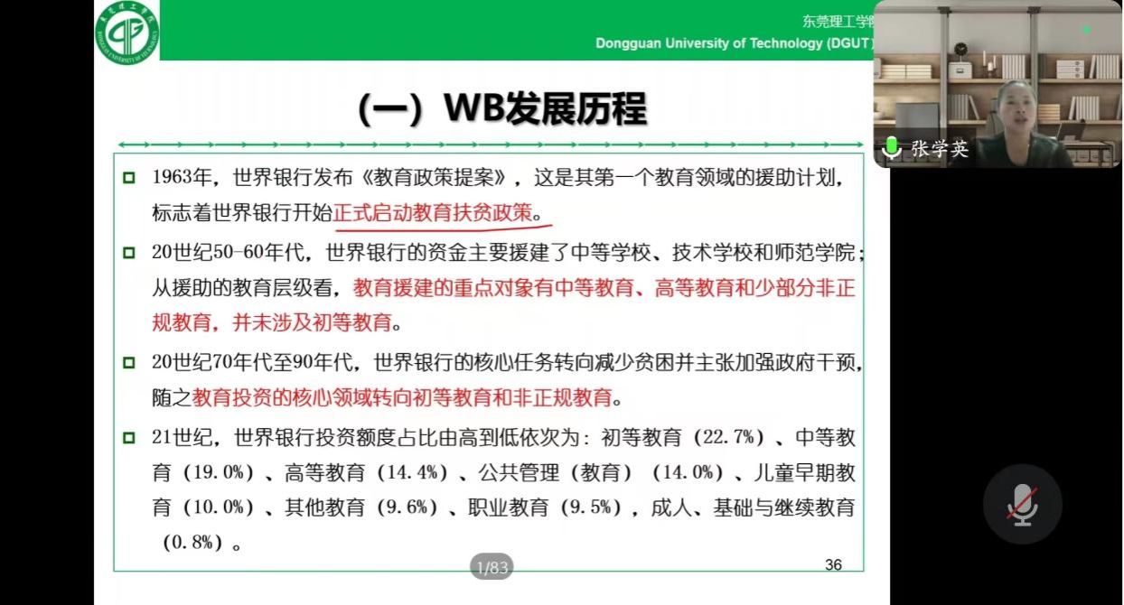 随后,张学英教授以“职业教育与培训反贫困”、“全口径教育反贫困”为分论点,以“联合国教科文组织”、“世界银行”为重点阐述对象,进一步论证了其中心观点,并通过分析典型特征、介绍组织发展历程等方式细致地讲解了走向共同富裕视域下不同组织在教育反贫困工作中的突出成果,促进同学们更加深刻理解教育反贫困核心内涵。