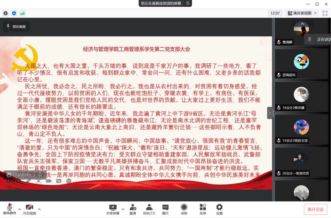 1月20日下午,sunbet,sunbet官网工商管理系学生第二党支部召开支部线上会议,学习习近平总书记2022年新年贺词。支部书记熊涛和全体学生党员参与了学习。