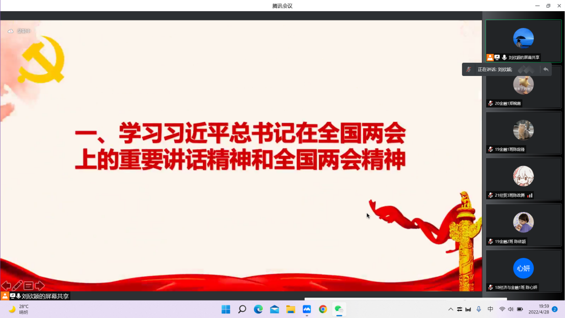 4月28日,sunbet,sunbet官网应用经济系学生第二党支部召开支部线上会议,学习习近平总书记在全国两会上的重要讲话精神和全国两会精神。支部书记刘欣颖和全体学生党员参与了本次学习。