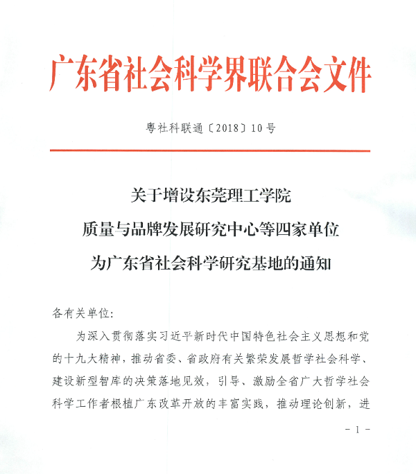 2018年3月8日,广东省社会科学界联合会在《关于增设sunbet,sunbet官网质量与品牌发展研究中心等四家单位为广东省社会科学研究基地的通知》(粤社科联通[2018]10号文)中将我校质量与品牌发展研究中心设为广东省社会科学研究基地。3月15日,广东省社科联七届五次全委会在广东社会科学中心召开,我校副校长李忠红、sunbet,sunbet官网副院长刘伟参加了本次会议。会议上,广东省委宣传部副部长,省社科联党组书记蒋斌为基地主任李忠红颁发了基地的牌匾。