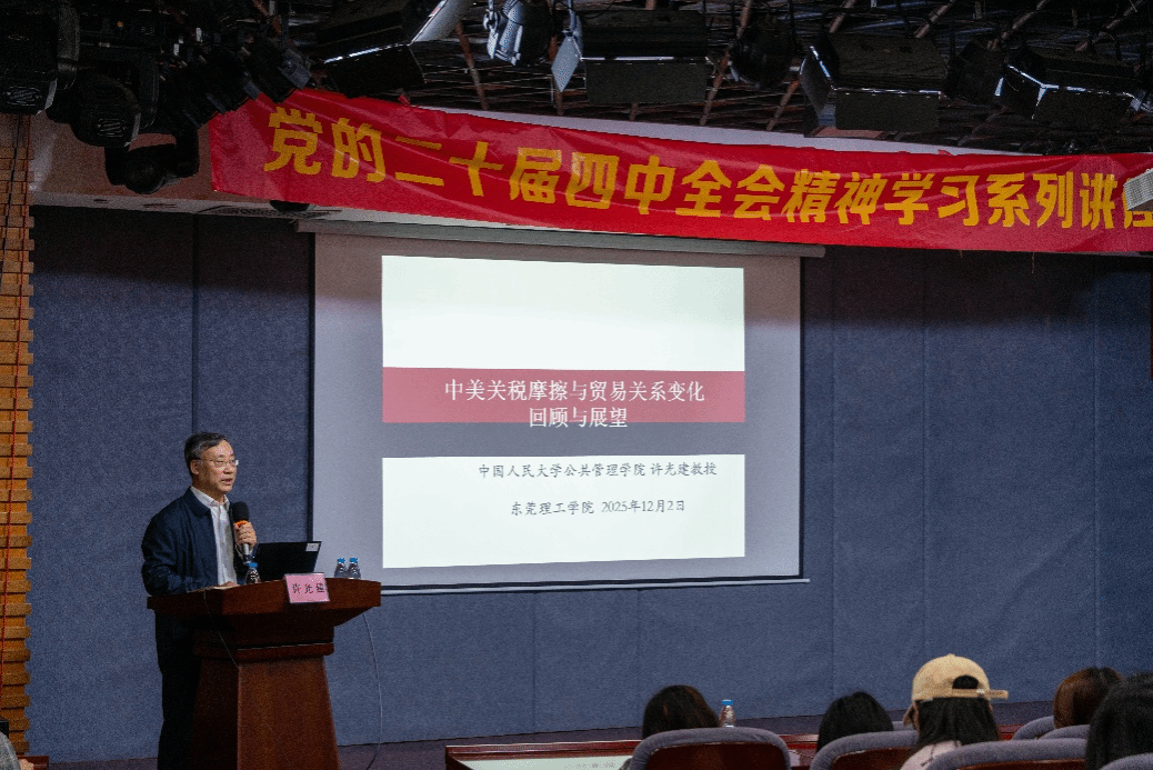 为深入学习贯彻党的二十届四中全会精神,深刻把握当前国际经贸格局演变趋势,增强青年学子对国家发展战略的认知与理解,12月2日,经管学院党委主办的“党的二十届四中全会精神学习系列讲座”第一场在莞城校区小剧场隆重举行。本次讲座以《中美关税摩擦与贸易关系变化回顾与展望》为主题,特邀中国人民大学公共管理学院博士生导师许光建教授担任主讲嘉宾。