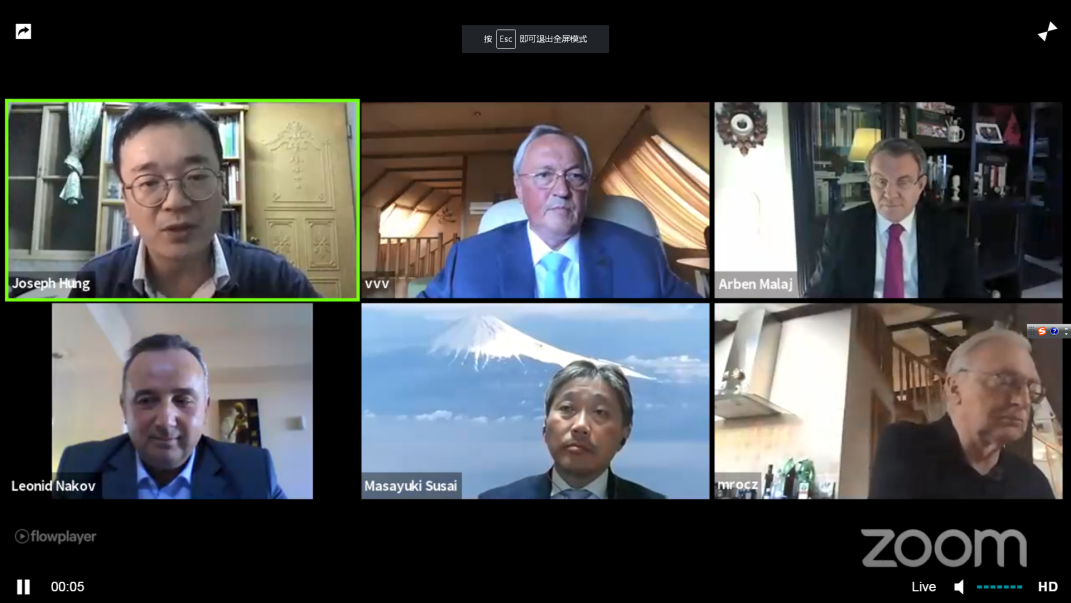 洪志远博士参与商业环境影响的分组讨论,会议由来自北马其顿的圣西里尔与美多德大学Leonid Nakov教授主持。参与者包括来自阿尔巴尼亚的前财经部长Arben Malaj教授、美利坚大学的Tomasz Mroczkowski教授、日本长崎大学的Masayuki Susai教授以及俄罗斯中央投资银行的Vasily Vysokov主席。洪博士首先针对国内经济现状进行分析,随后通过我校的疫情对经济影响分析课题组,经管院与东莞市工商联合作的一系列报告,详细向与会者说明东莞作为中国经济快速发展的一个典型案例,在面对疫情的不确定商业环境下的企业经营现况与政策建议。作为对抗新冠疫情的先行者,东莞经验乃至中国经验是世界各国在后疫情时代的一个参考样板。