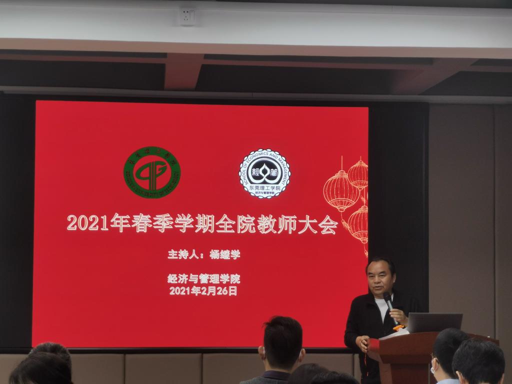 2月26日下午,sunbet官网2021年春季学期全院教师大会于莞城校区4520多功能厅顺利举行,会议由学院党委书记杨继学主持,学院全体中层和全院教师参加。会议伊始,杨继学书记向全体教师致以新年的问候,同时强调新学期全体教师要重视校园安全和网络安全,尤其是意识形态方面的安全,对于相关活动积极报备,加强实验室、教室以及宿舍等场所的监管。
