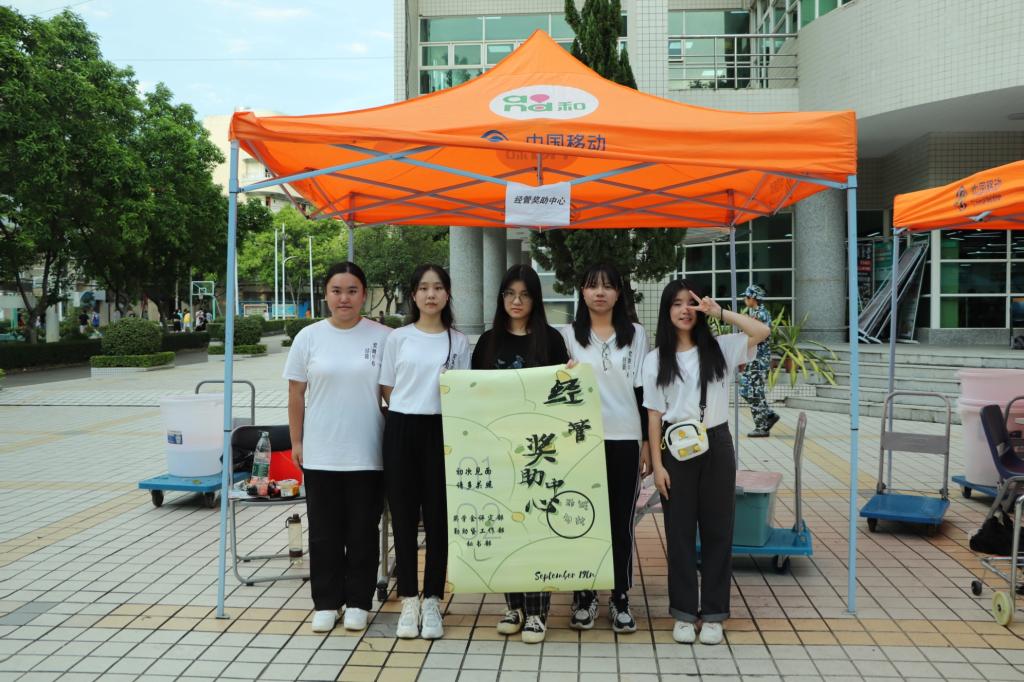 9月19日下午,为鼓励新生坚持完成军训任务,sunbet,sunbet官网团委、学生会,新闻中心,学生党建办公室,奖助中心四大学生组织于莞城校区第一饭堂前开展了军训送清凉活动。