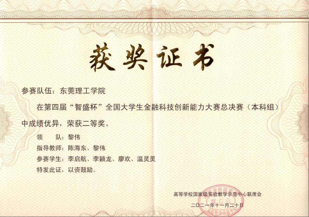 第四届“智盛杯”全国大学生金融科技创新能力大赛全国总决赛颁奖仪式于12月15日在线上举行,由2019级投资学专业的李启航、温灵灵、廖欢、李颖龙组成的竞赛队伍最终获得全国总决赛二等奖。