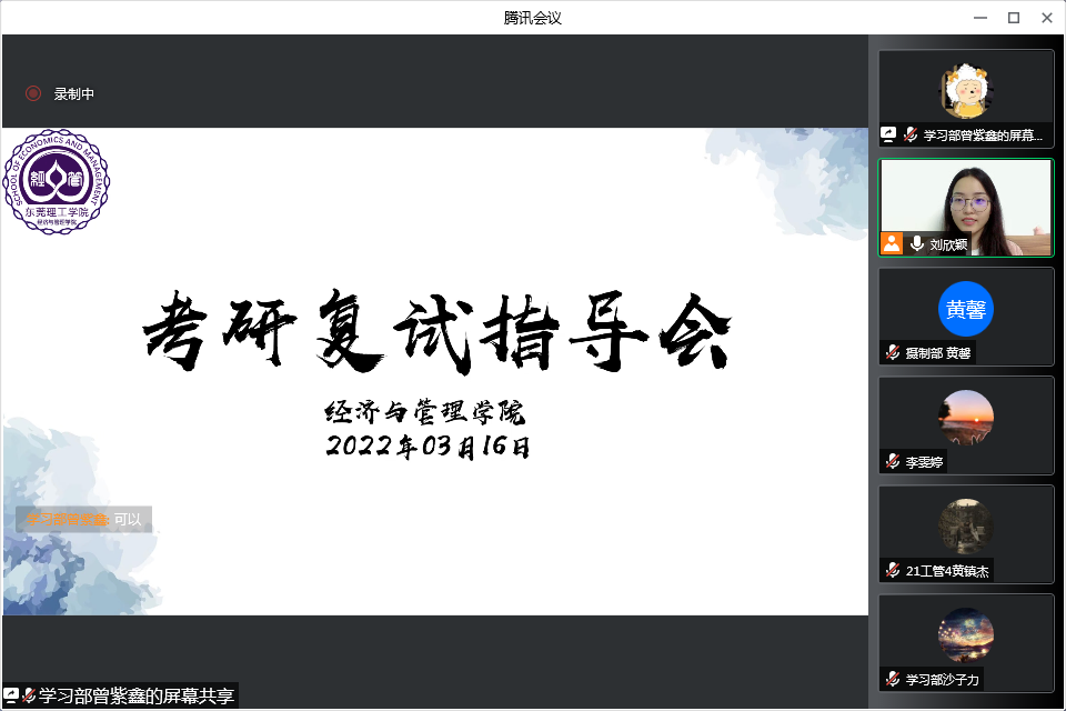 为做好考研帮扶工作,助力学院学生考研升学,增强复试应对能力,3月16日晚,经管学院于线上开展复试指导会。学院副院长刘川,学院辅导员刘欣颖,2017级会计学专业邵敏师姐、2017级金融管理产学国际班陈春颜师姐出席本次会议,为sunbet官网学子提供复试指导与经验分享。
