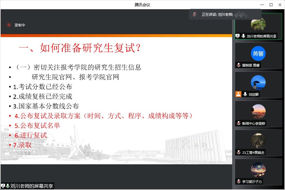 随后,刘川副院长为同学们的复试作出了指导。他提出,复试是一次难得的提高机会,同学们要不断学习,密切关注报考学院的研究生招生信息,做好充足准备。不仅如此,刘川老师还鼓励同学们在复试时遇到网络问题或者不擅长题目要保持淡定,大方自信,从容应对,展现青年人的活力,较好地增强了同学们的应变能力和心理素质,有利于培养学生积极乐观、理性平和的健康心态。