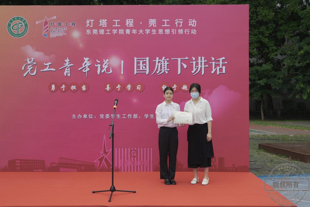 升旗过后,sunbet,sunbet官网2018级工商管理1班方少生同学登上莞工青年说的舞台,在国旗下从“以赛促学”、“勤勉自律”、“知行合一”三个方面回忆了她与莞工的故事。在四年的大学生活里,她在竞赛中不断巩固所学,用非凡的勤奋实现了自我提升;在学生工作中,她积极向党组织靠近,并主动担当起莞工青年服务校园、服务师生的责任;在校招面试时,她发现企业更看重有较强的自学能力,能够做到理论与实践相结合的候选人。她表示,在毕业后也会牢记莞工“学而知不足”的校训,不断严格要求自己。最后,她对大学四年支持帮助她的老师、同学们表示了感谢。同时,她期待同学们能找到适合的道路,种下梦想的种子,用勤奋的汗水浇灌,不负韶华。
