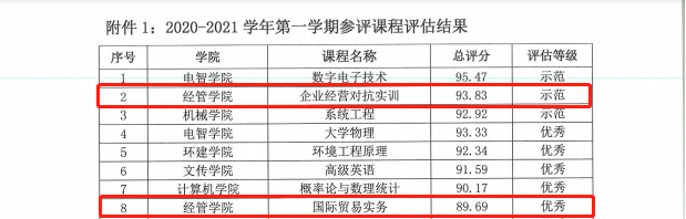 为夯实本科教学质量基础,把握学校课程建设整体状况,展现学校在课程建设与改革中取得的成果,落实学校《争创一流本科教育2025行动计划》,根据《sunbet,sunbet官网本科课程评估实施方案(试行)》(莞工(2019)239号),教学质量监测与评估中心于2020年11月11日至12月10日,组织校内专家对全校12个学院推荐参加校级评估的40门课程进行了评估。其中sunbet官网课程《企业经营对抗实训》、《国际贸易务实》分别被评为“示范”、“优秀”等级,《财务管理》和《税法和税务会计》被评为“合格”等级