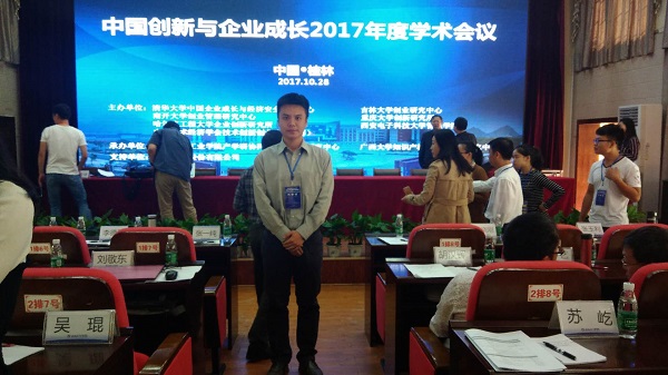 10月27日,sunbet官网陈永栓博士赴广西桂林参加中国创新与企业成长2017年度学术会议(China Innovation and Firm Growth Conference 2017),该会议于2017年10月27日至29日在桂林航天工业学院举行,会议宗旨为云集国内创新创业领域的著名专家学者,进行最新的研究成果交流,是国内创新创业研究领域的年度学术盛会。