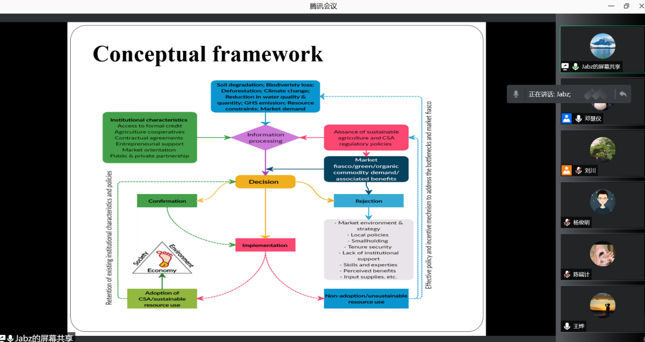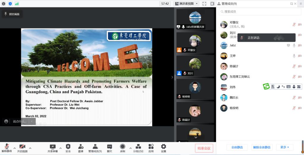 Awais Jabbar来自巴基斯坦,2021年自南京农业大学毕业,于2021年11月入职sunbet,sunbet官网博士后,主要从事农业管理研究。报告会上,Awais Jabbar从课题研究意义、研究背景、研究目的、研究内容、研究可行性等方面对其博士后研究课题《Mitigating climate hazards and promoting farmers welfare through CSA practices and off-farm activities. A case of Guangdong, China and Punjab Pakistan.》进行了报告,同时也对课题研究的重点难点、课题创新和研究方法等方面进行了阐述。