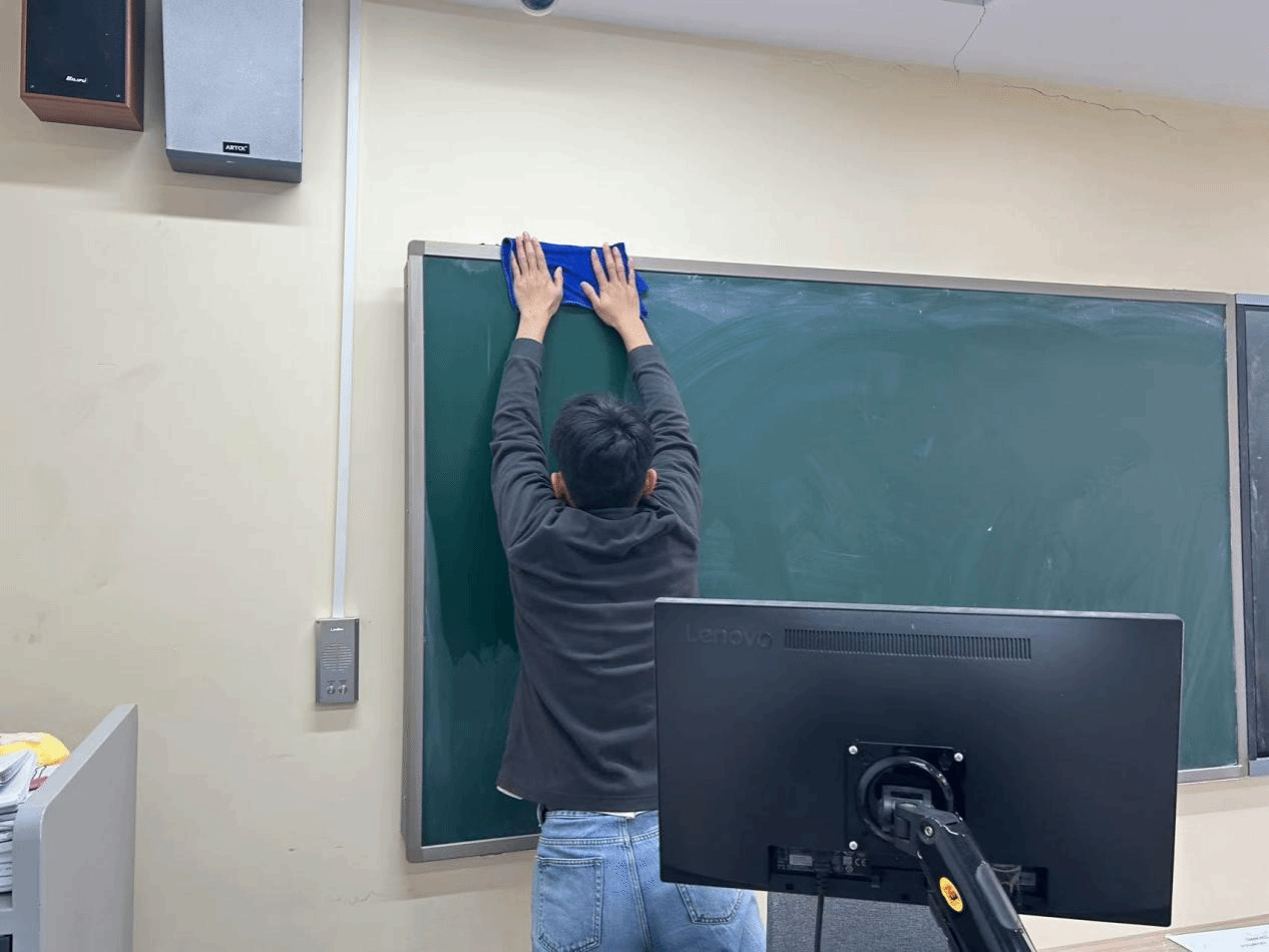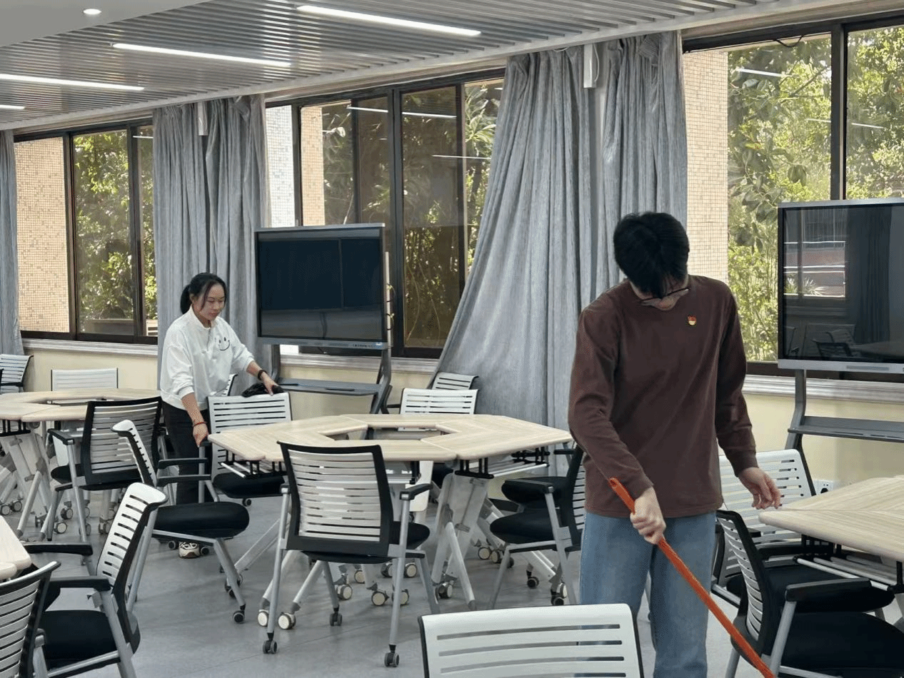 活动中,党员们拿起扫帚、拖把、抹布等工具,对3栋教学楼课室的黑板、窗户、桌椅和地面等区域进行了全面清扫。大家分工明确,有的负责清扫地面,有的负责抹去污渍,有的负责清理垃圾。经过两小时的辛勤劳动,3栋教学楼课室的面貌焕然一新,窗明几净,地面整洁,党员们为在课室里上课的同学们营造了温馨舒适的生活环境。