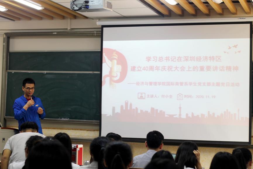 随后,付小全老师结合习近平总书记的重要讲话,从“深圳经济特区五大历史性跨越、深圳等经济特区40年改革开放实践十条经验、新时代党中央赋予深圳的七大任务、推动经济特区工作开创新局面六大要求”四个部分进行具体讲解,要求学生党员坚定理想信念,更新知识观念,掌握过硬的知识本领。同时表示希望学生党员们能够更多地进行党课学习,提高党性修养。