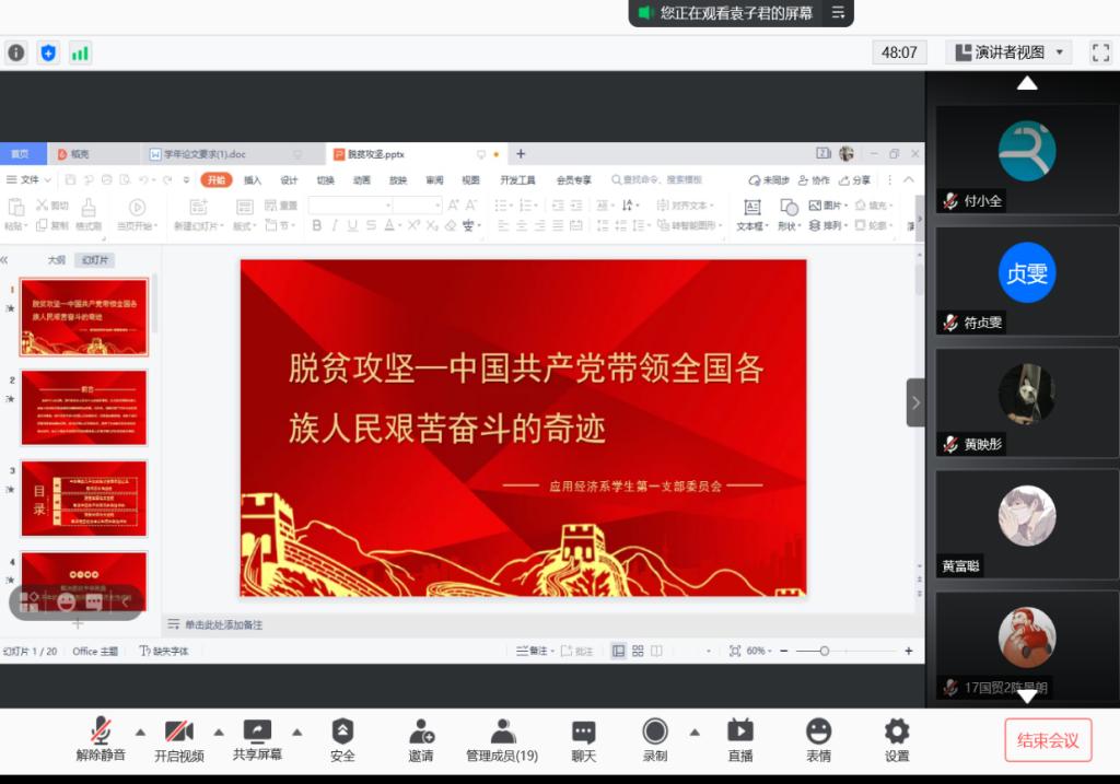 6月17日,经管与管理学院应用经济系学生第一党支部开展“汲取精神力量助力脱贫攻坚”线上主题党日活动,学习习近平总书记关于脱贫攻坚的重要论述精神。会议由支部书记付小全同志主持,全体党员出席。