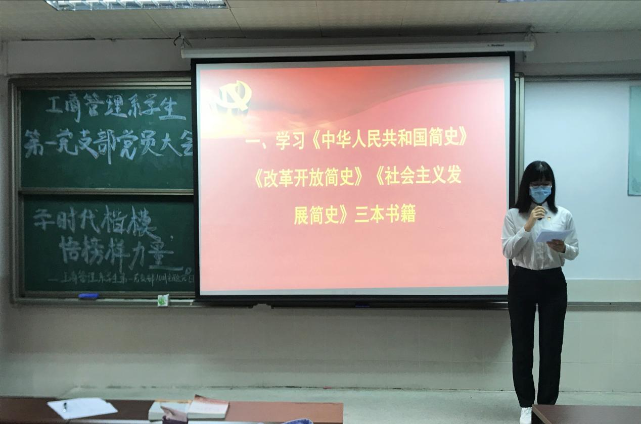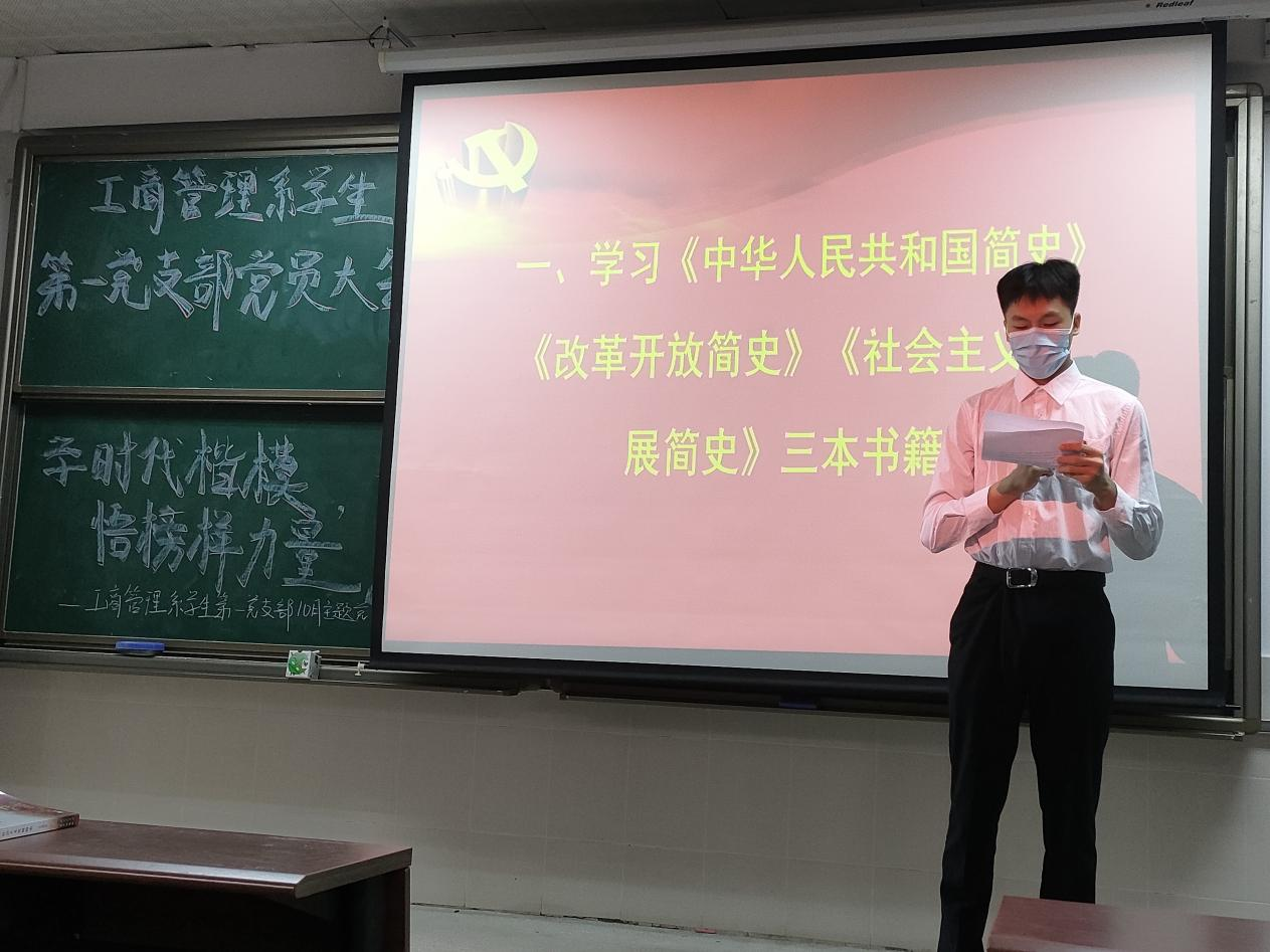为推动党史学习教育深入开展,落实“第一议题”学习制度,会前,工商管理系学生第一党支部党员已提前传阅学习《中华人民共和国简史》、《改革开放简史》、《社会主义发展简史》这三本书籍。会上,党员同志们针对三部简史的学习踊跃分享自己的心得感悟,充分体现了深入学习《中华人民共和国简史》、《改革开放简史》、《社会主义发展简史》对党员同志在筑牢理想信念、牢记初心使命等方面的重要作用。
