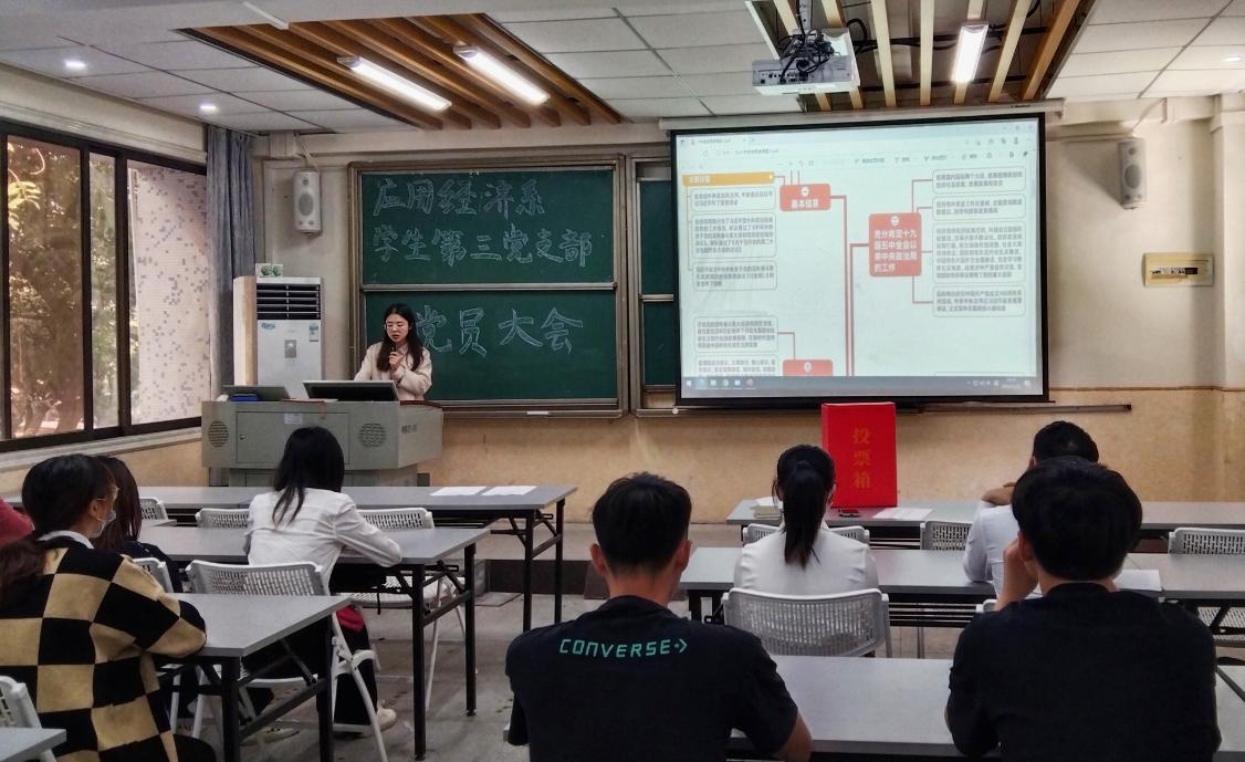 2021年11月15日,应用经济系学生第三党支部于莞城校区5204课室召开专题学习会,学习贯彻党的十九届六中全会精神。大会由支部书记叶琦玮同志主持,全体学生党员出席。