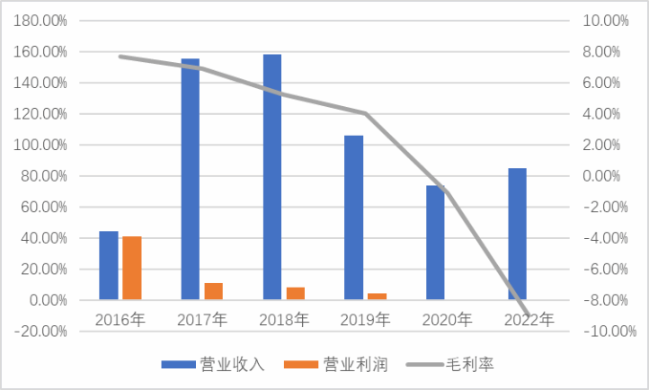 搜于特的营收变化如同一辆过山车,主要分为两个阶段,在2014年时,搜于特的营收才10亿出头,2015-2017年,特别是2016年和2017年,两年都有近两倍的增长幅度,三年时间增长了10多倍,超过了180亿元;2018年,营收在180亿元左右稳定了一年,然后就是持续的大幅下跌,在2022年前三季度,营收又回到了10亿出头。