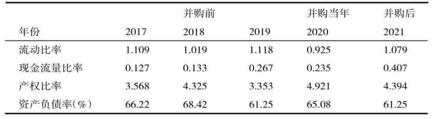 截止至2020年第一季度末,TCL科技账面上的流动资产合计542.33亿元,扣除各类应收款项、金融资产,实际可支配货币资金为197.7亿元。在最终交易里,TCL科技以125亿美元取得对中环集团的并购资格,这也显示此次并购一次性耗费了TCL科技63%的存量资金。并购中环集团后,企业流动比率相对于并购前有所下降,并购消耗了企业大量的资金,使得企业的流动资产减少,流动比率低于1%。另一方面,企业在2020年的现金流量比率也有所下降,这表明TCL科技对中环集团的收购行动在短期内对企业偿债能力产生不利影响,甚至引发财务风险。