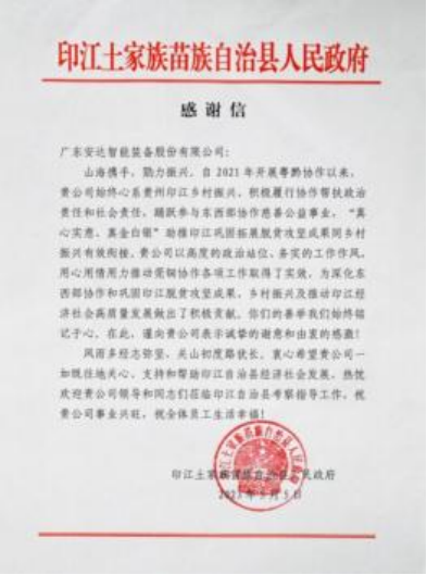 2023 年 5 月安达智能荣膺印江土家族苗族自治县人民政府授予的“公益慈善突出贡献奖”。这一荣誉是对安达智能在公益慈善事业中的突出表现和无私奉献的肯定。