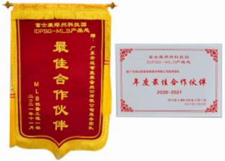 2021 年,富士康郑州科技园手机主板生产部(MLB)新产品爬坡期间,安达智能服务团队对于富士康提出的大数据上传、防呆软件、以及 SPC 自动称重软件的优化导入,安达智能能够安排人员第一时间配合,保证富士康产品生产进度如期达成。为此,富士康授予安达智能技术服务团队“最佳合作伙伴”荣誉,并同时为安达智能的服务团队颁发了水晶牌匾及锦旗。