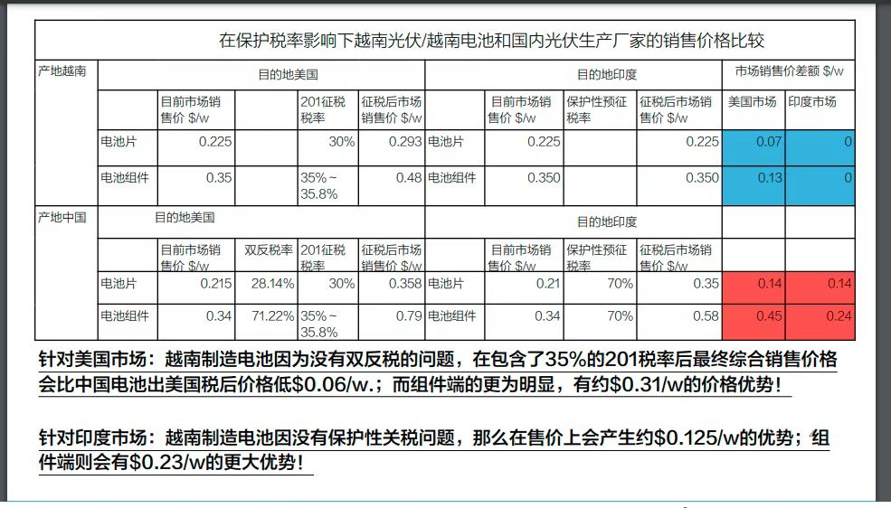 当地时间2018年1月5日,印度保障措施总局做出印度光伏保障措施调查初裁,向印度中央政府提出临时措施建议。保障措施总局建议对进入 印度的太阳能光伏产品(包括晶体硅电池及组件和薄膜电池及组件)征收 70%的从价税作为临时保障措施税,为期200天。同时建议在印度特殊 经济区(SEZ)的企业不受保障措施影响。下图1为在保护税率下越南光伏/电池和国内厂家的价格比较。