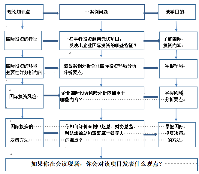 具体来说,首先引导学员总结易事特投资越南光伏项目的内容,探讨国际投资的基础问题(问题 1);通过对基础型问题的探讨,进一步引导学员思考国际投资的影响因素、环境分析以及风险分析,分析总结国际投资相关的理论知识点(问题 2、3),最后结合易事特投资越南光伏项目过程中的争议要求学员进行观点评价并提出自己的投资决策意见(问题 4、5)。