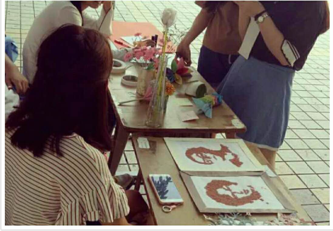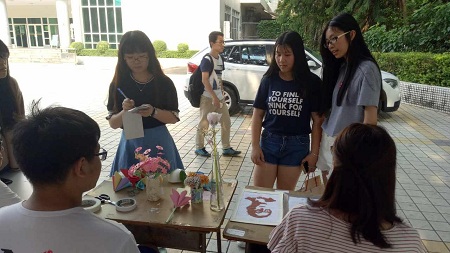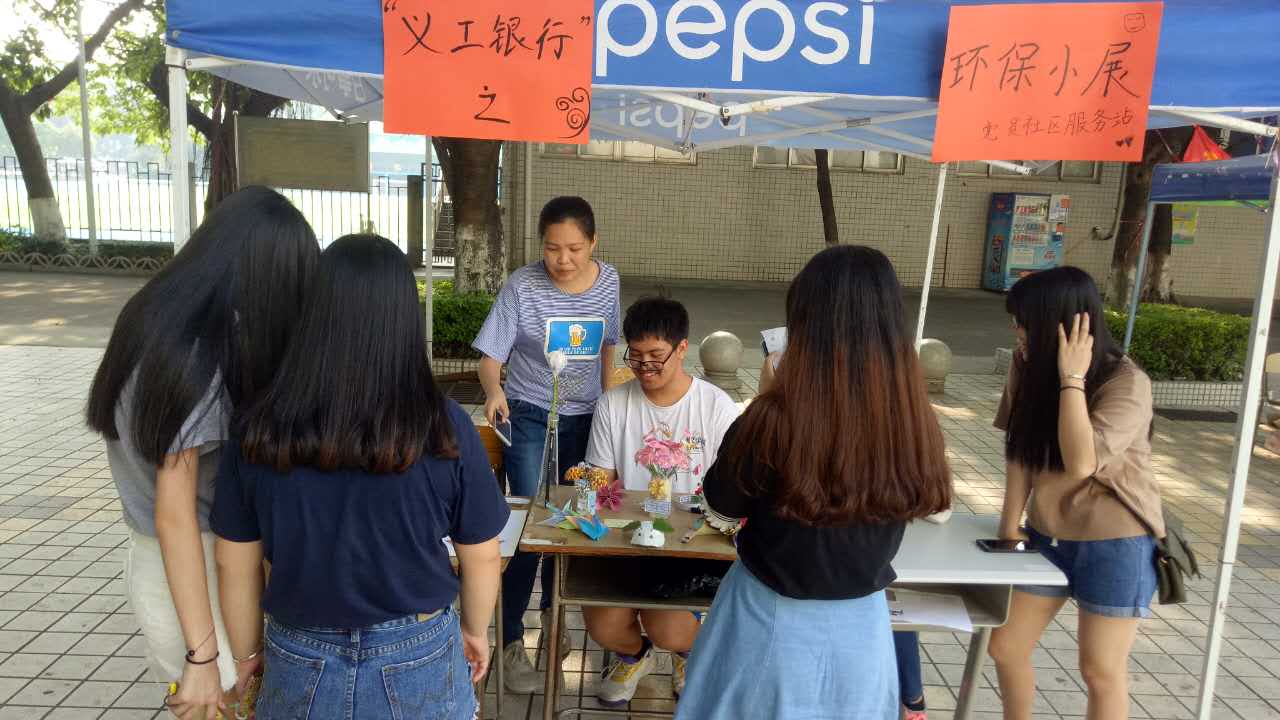 2017年5月11日下午,sunbet,sunbet官网党员社区服务站于莞城校区一饭旁进行“义工银行”党建公益系列活动——环保创意作品展示。